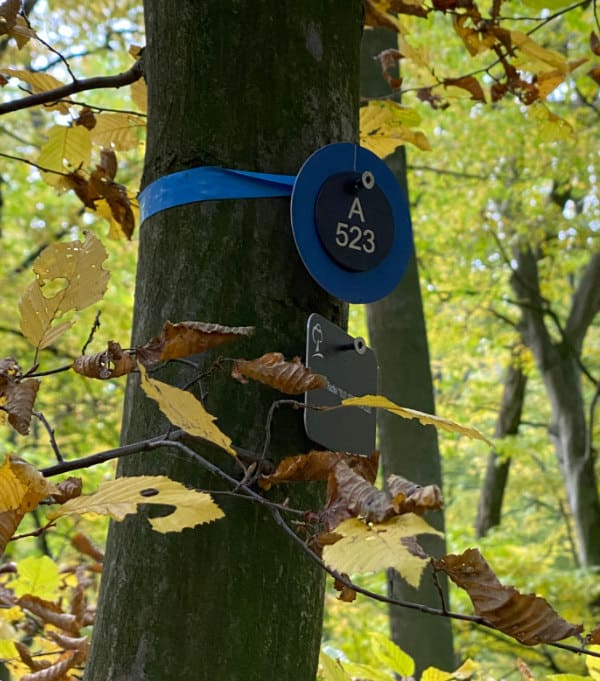 Bäume mit freien Plätzen erkennen Sie an einer blauen Plakette und einem blauen Band, das um den Baum gebunden ist.